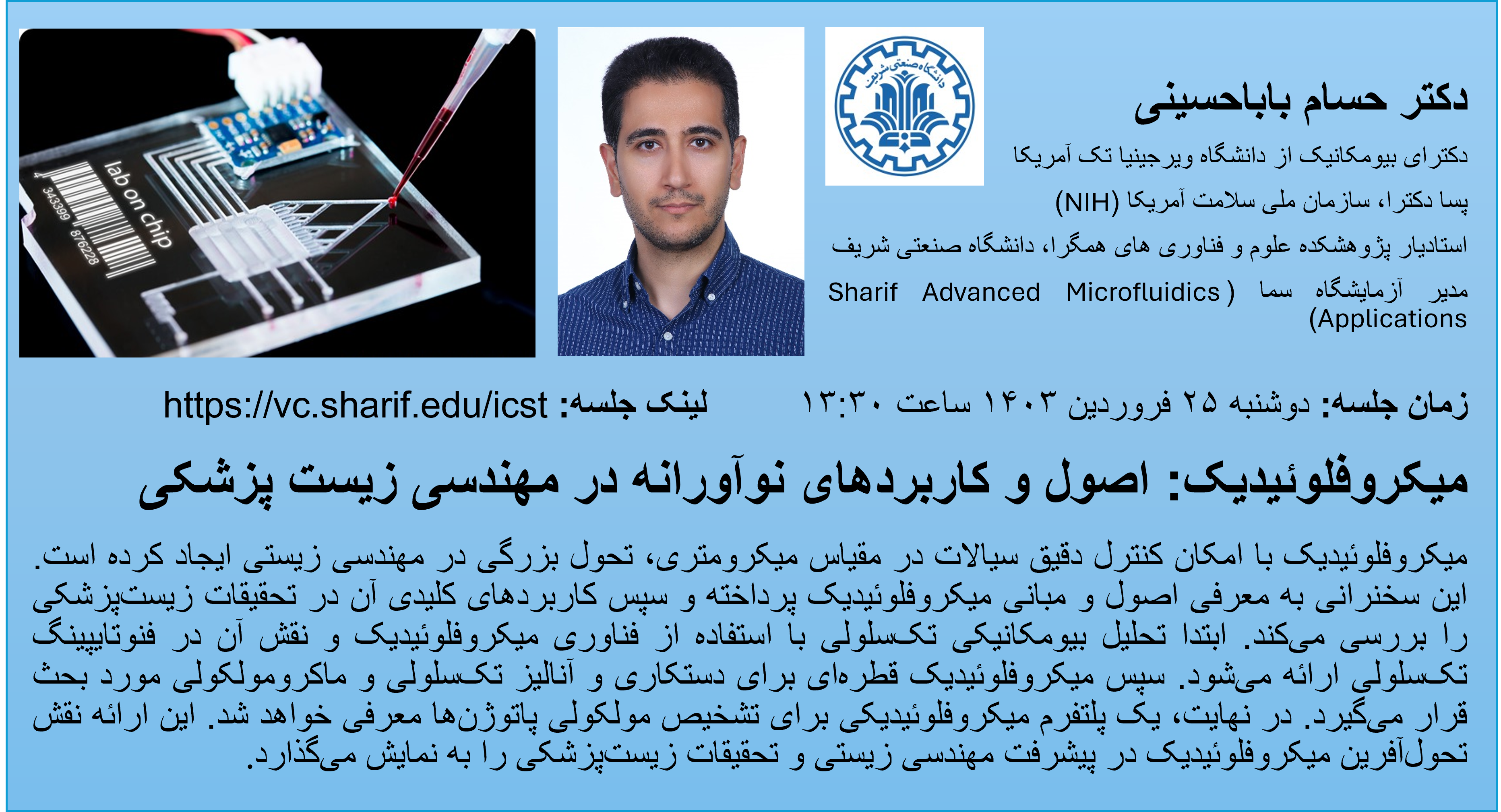 برگزاری سمینار هفتگی روز دوشنبه 25 فروردین با ارائه آقای دکترحسام  باباحسینی هیأت علمی پژوهشکده  با موضوع "میکروفلوئیدیک: اصول و کاربردهای نوآورانه در مهندسی زیست پزشکیراس ساعت 13:30 به صورت حضوری در سالن کنفرانس مرکز نانو برگزار خواهد شد.