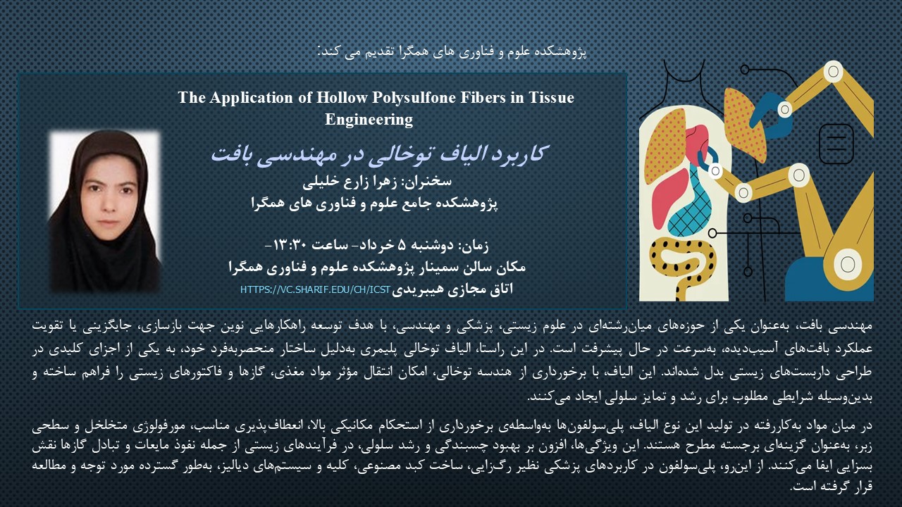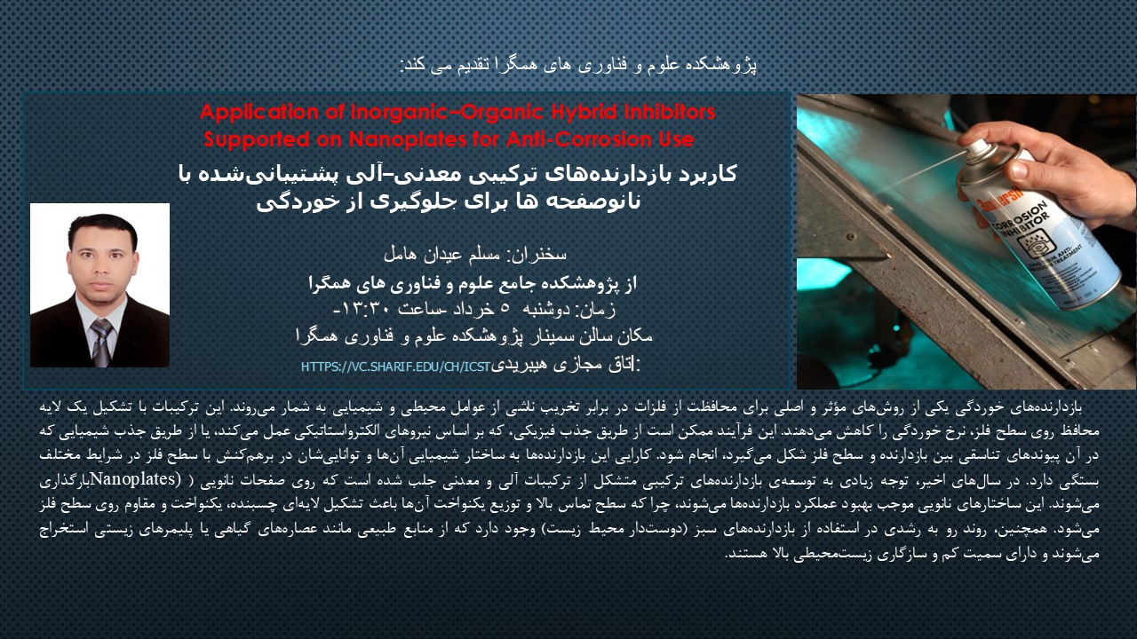 سمینار هفتگی روز دوشنبه 5 خرداد با ارائه سمینار عمومی سرکار خانم زهرا زارع خلیلی و جناب آقای مسلم عیدان هامل به ترتیب با موضوعات "کاربرد الیاف پلی سولفون تو خالی در مهندسی بافت" و"کاربرد بازدارندههای ترکیبی معدنی–آلی پشتیبانیشده با نانوصفحهها برای جلوگیری از خوردگی" راس ساعت 13:30 به صورت حضوری در سالن کنفرانس مرکز نانو پژوهشکده برگزار خواهد شد.