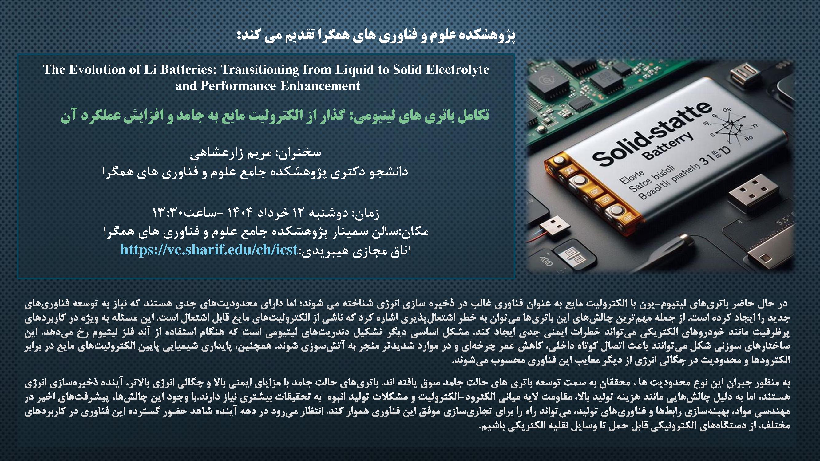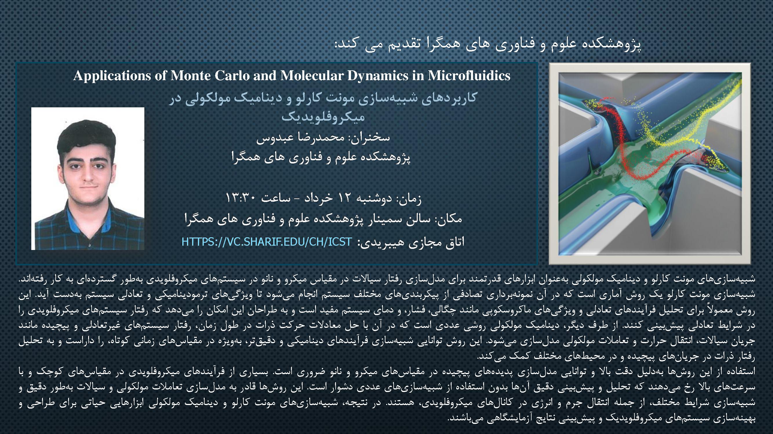 سمینار هفتگی روز دوشنبه 12 خرداد با ارائه سمینار عمومی خانم مریم زارعشاهی و آقای محمدرضا عبدوس به ترتیب با موضوعات "تکامل باتری های لیتیومی: گذار از الکترولیت مایع به جامد و افزایش عملکرد آن" و" کاربردهای شبیه سازی مونت کارلو و دینامیک مولکولی در میکروفلویدیک" راس ساعت 13:30 به صورت حضوری در سالن کنفرانس مرکزنانو پژوهشکده برگزار خواهد شد.