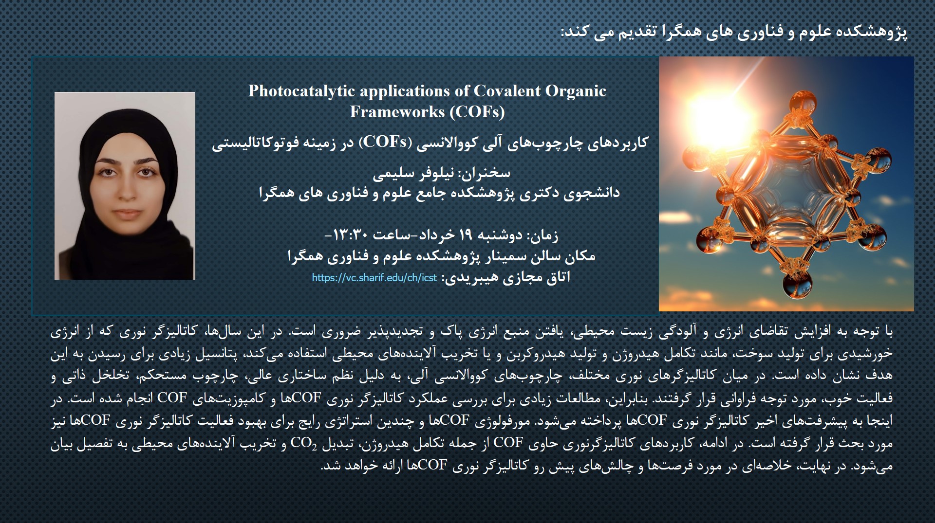سمینار هفتگی روز  دوشنبه 19 خرداد با ارائه سمینار عمومی  خانم نیلوفر سلیمی و آقای محمد تحققی به ترتیب با موضوعات  "کاربردهای چارچوب های آلی- کووالانسی (COFs) در زمینه فوتوکاتالیستی" و" فرآیند های اصلاحی  پس از ساخت سلول های خورشیدی  پروسکایتی" راس ساعت 13:30 به صورت حضوری در سلان کنفرانس مرکز نانو پژوهشکده برگزار خواهد شد.