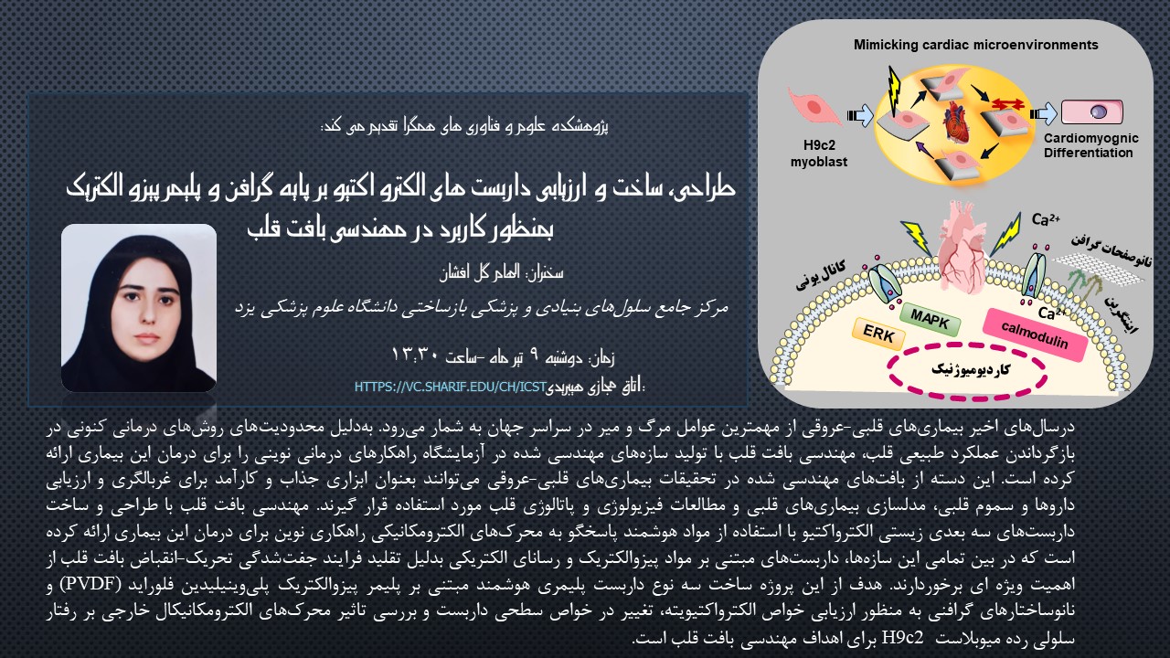 سمینار هفتگی روز دوشنبه 9 تیر با ارائه پیش دفاع خانم الهام گل افشان با موضوع "طراحی، ساخت و ارزیابی داربست های الکترو اکتیو بر پایه گرافن و پلیمر پیزو الکتریک به منظور کاربرد در مهندسی بافت قلب"راس ساعت 13:30 به صورت مجازی برگزار خواهد شد.