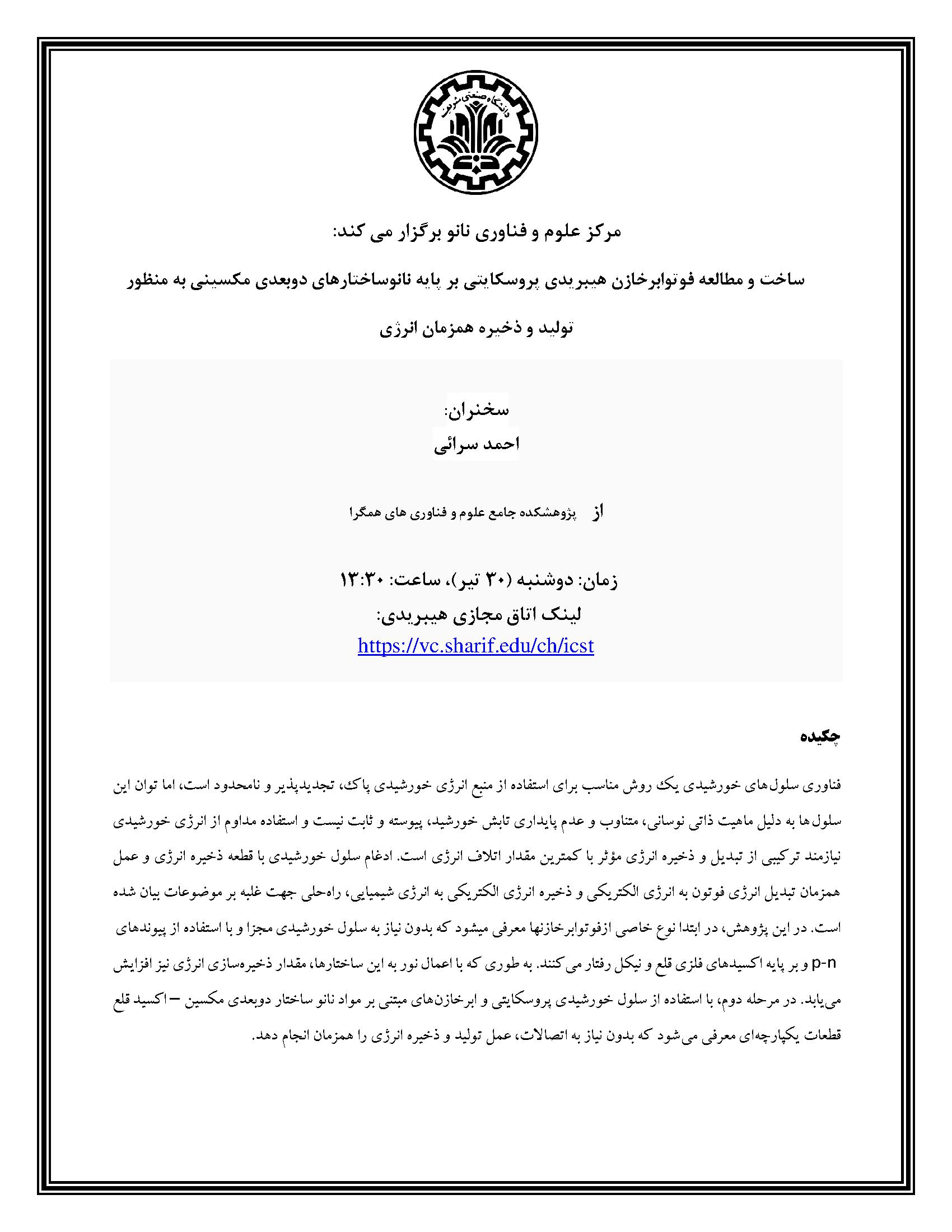 سمینار هفتگی روز دوشنبه 30 تیر با ارائه گزارش پیشرفت آقای احمد سرائی با موضوع " ساخت و مطالعه فوتوابرخازن هیبریدی پروسکایتی بر پایه نانوساختارهای دوبعدی مکسینی به منظور تولید و ذخیره همزمان انرژی" راس ساعت 13:30 به صورت مجازی برگزار خواهد شد.