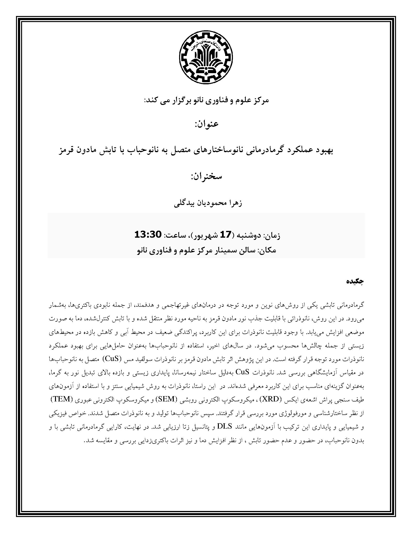 سمینار هفتگی روز دوشنبه 17 شهریور با ارائه گزارش پیشرفت خانم زهرا محمودیان بیدگلی با موضوع " بهبود عملکرد گرما درمانی نانوساختارهای متصل به نانو حباب با تابش مادون قرمز" تحت راهنمایی آقای دکتر احدیان راس ساعت 13:30 به صورت حضوری در سالن کنفرانس مرکز نانو پژوهشکده برگزار خواهد شد.